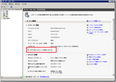 サーバーマネージャーの「ログオン時にこのコンソールを表示しない」にチェックを入れたが、起動時に表示されてしまう。